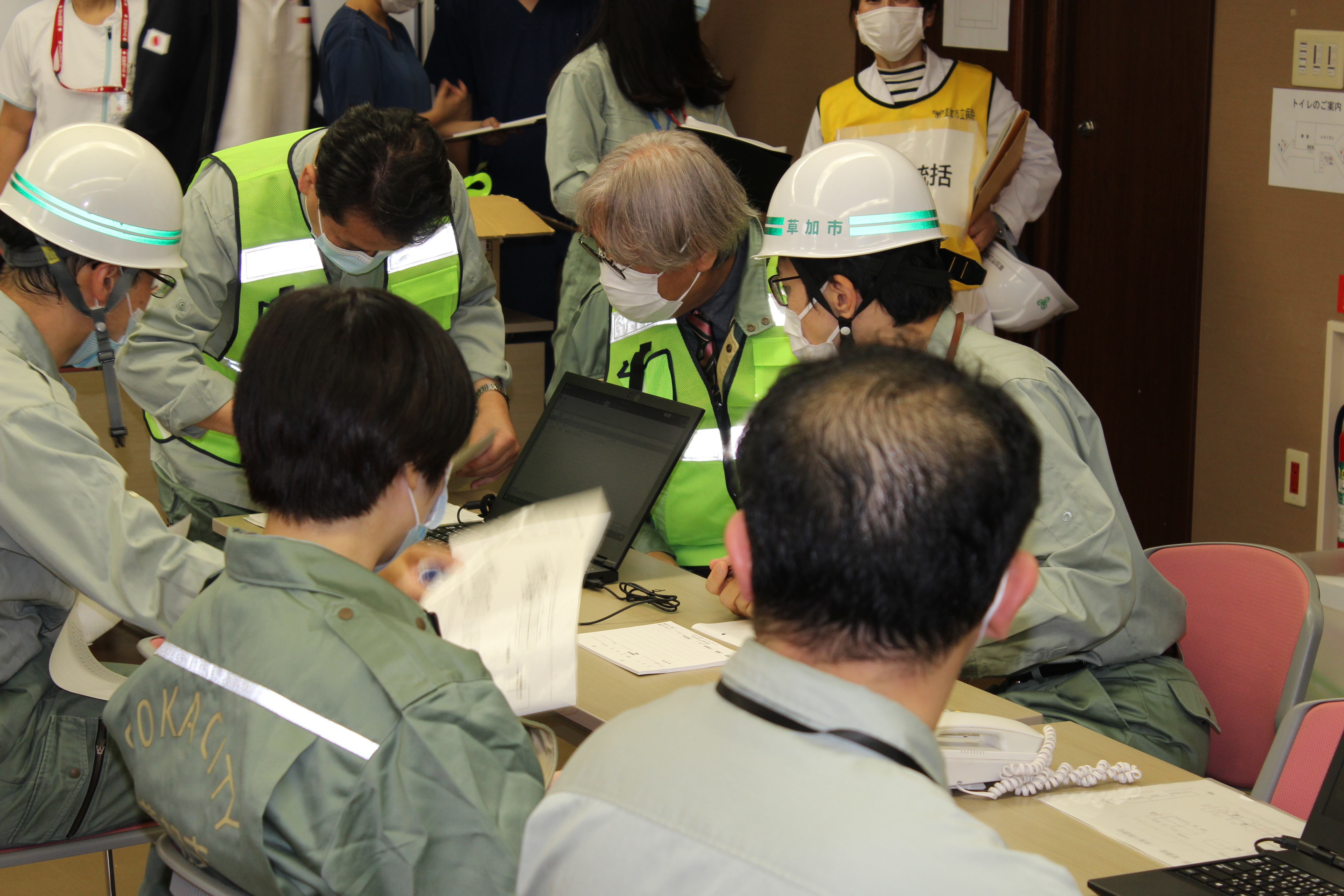休日日中に発生した地震を想定した訓練が行われました。徐々に職員が参集する中で、人数に見合った配置を検討しながら本部機能や診療機能の拡大を検討する訓練となりました。